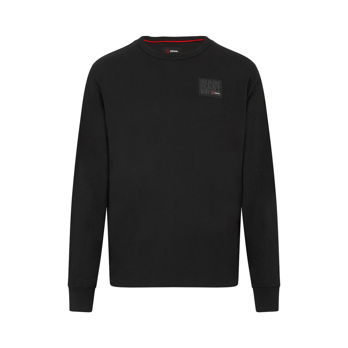 În imagine este un tricou negru cu mâneci lungi și decolteu rotund. Tricoul are pe partea stângă a pieptului un mic logo cu inscripția "THE RAIN MASTER". Marginea decolteului este cusută cu fir roșu. Materialul tricoului este din bumbac și confortabil, ideal pentru zilele mai răcoroase.