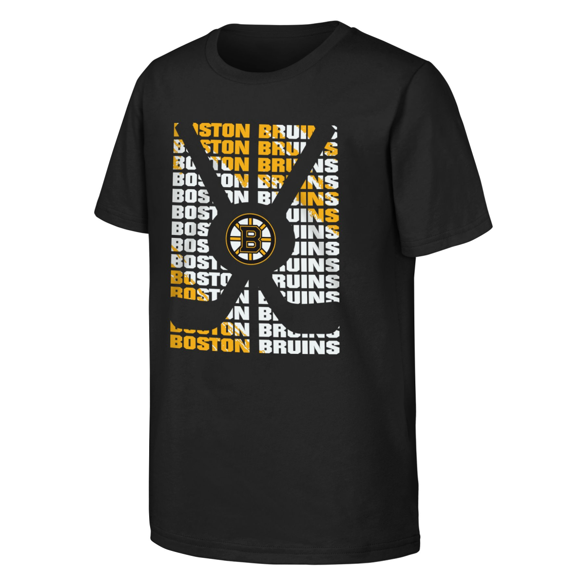 În imagine este un tricou negru cu motivul echipei de hochei Boston Bruins. Pe partea din față a tricoului este scris de mai multe ori "Boston Bruins" în culorile galben și alb, cu un logo mare al echipei Boston Bruins în mijloc.
