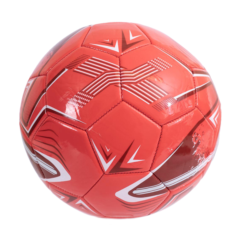În imagine este o minge de fotbal roșie cu sigla clubului Arsenal în mijloc. Mingea are dungi și modele decorative albe și negre.